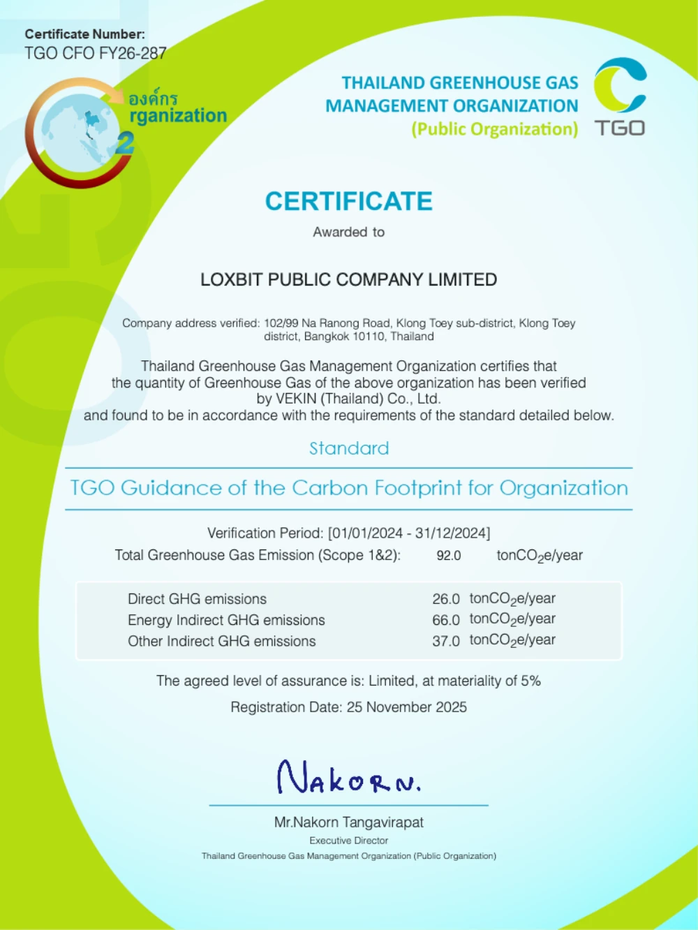 Loxley Public Company Limited, together with its two subsidiaries - Loxley Property Development Company Limited and Loxbit Public Company Limited – has been certified and registered for the Carbon Footprint for Organization (CFO) for the 2024 reporting year by the Thailand Greenhouse Gas Management Organization (Public Organization) (TGO), the national authority responsible for promoting and overseeing the assessment of greenhouse gas emissions of organizations in Thailand.